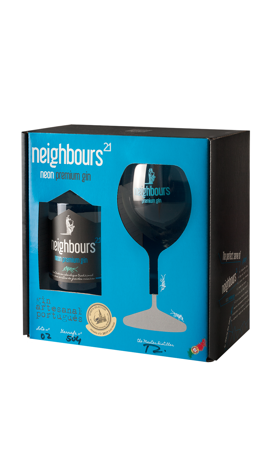 Agora também em versão caixa de oferta. O mesmo sabor, a mesma qualidade. Neighbours21 Neon Premium Gin, medalha de ouro, em caixa personalizada assinada e numerada manualmente pelo nosso Master Distiller, com oferta de copo vidro também ele personalizado.